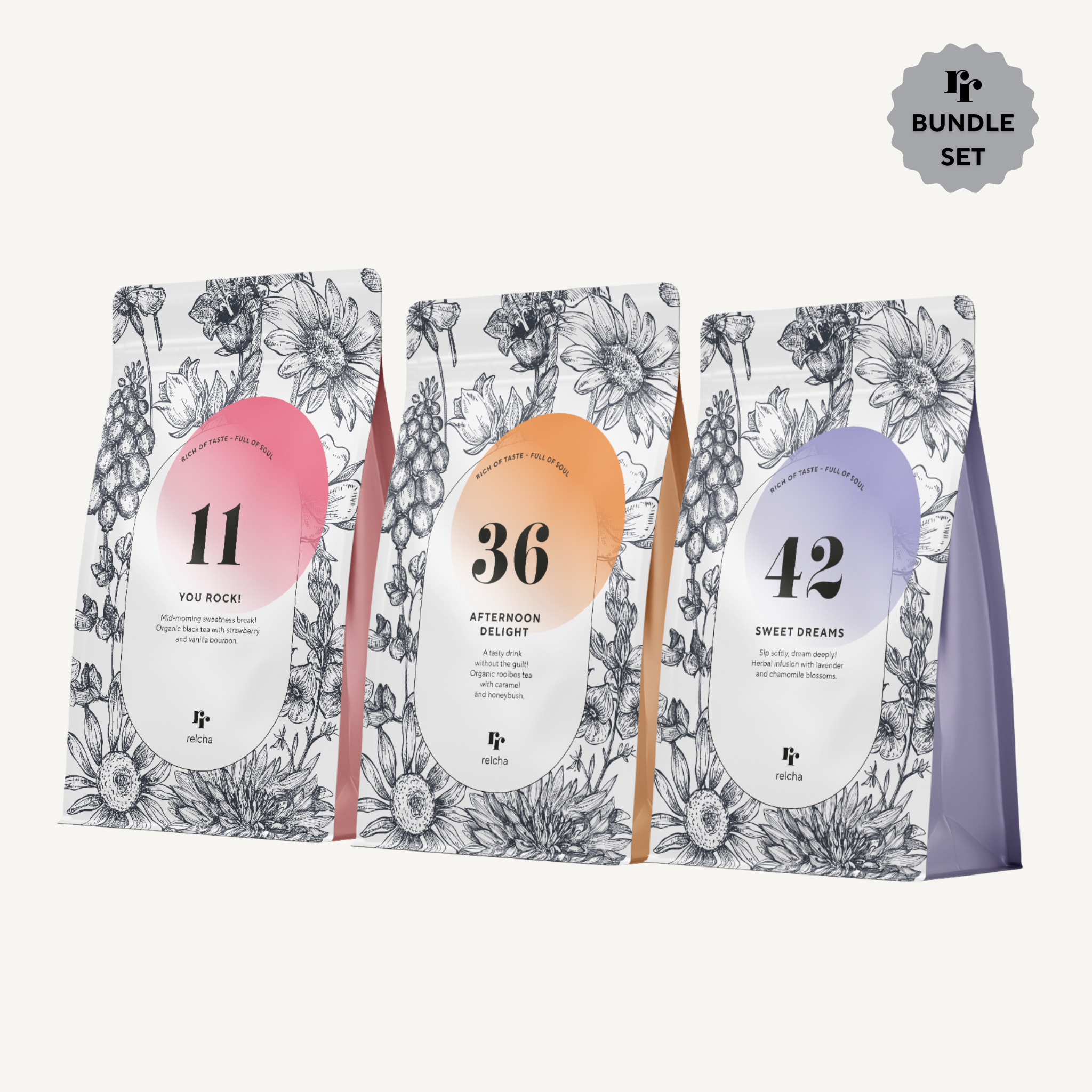Every Relcha blend begins with intention. We select organic leaves and botanicals. Our tea bags are biodegradable and our packaging is recyclable.